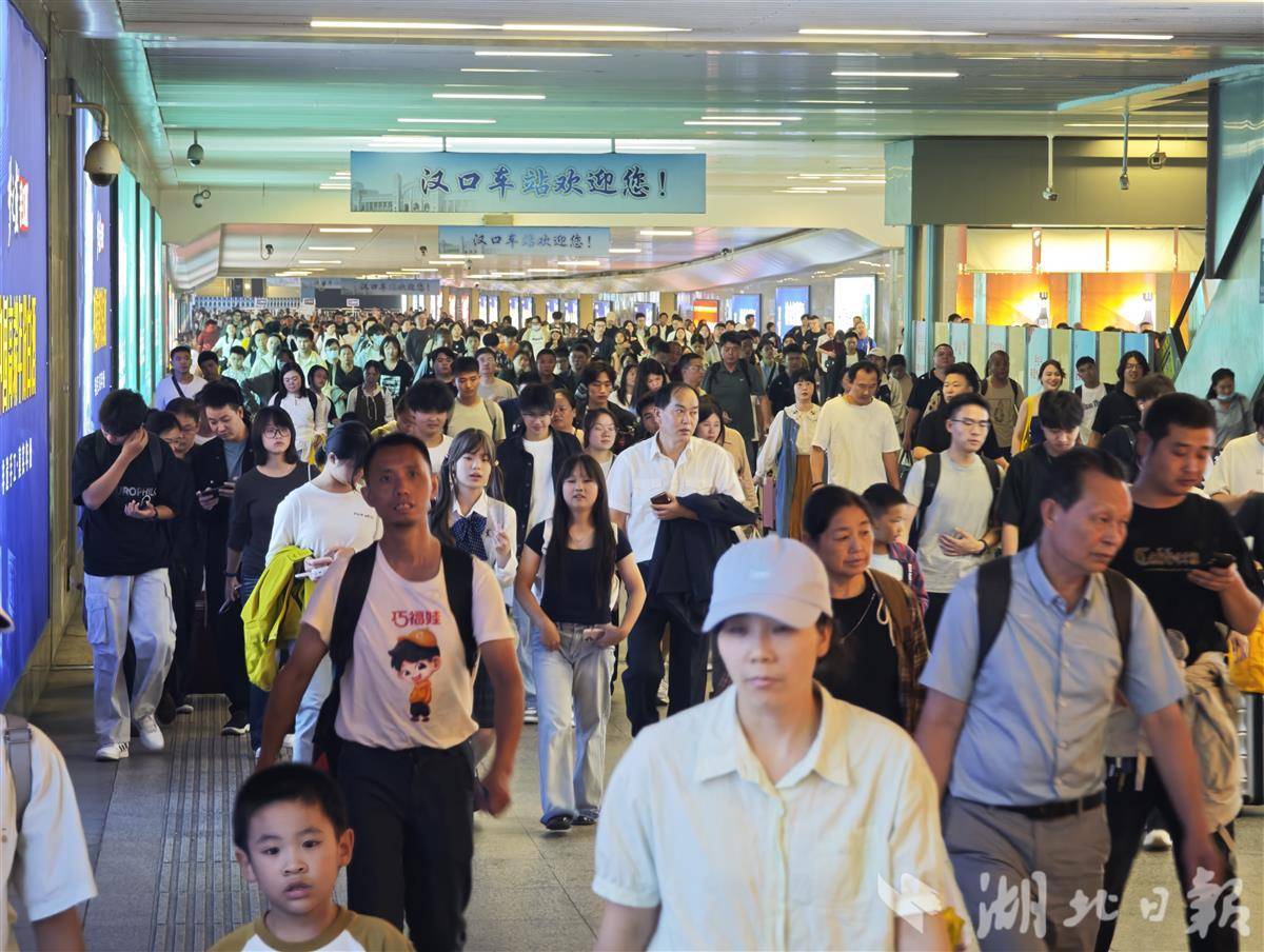 10月8日,返程旅客抵达汉口站。通讯员宋平 湖北日报提供(记者胡毅 通讯员吴铁轩)2025年国庆、中秋假期期间,中国铁路武汉局集团有限公司(以下简称武铁)实行错峰运行,新增旅客列车2000余列,运送旅客76.27亿人次,平均每趟旅客发送量 天。是 954,000。天;运输物资209.5万吨,保障圣诞物资供应。今年国庆节和中秋节“恰逢”。 10月1日至8日将连续8个假期,旅游、探亲、学生客流等出行需求相互交织、重叠。武汉铁路客流的特点是“始发站和终点站长途旅客多,间中短途旅客多”。 10月1日,乌哈n 铁路发送旅客122.1万人次,比上年增长8.9%,创单日旅客发送量纪录。汉口站和武汉站旅客发送量分别为24.5万人次和18.3万人次,比上年增长9.8%和10.9%,均创下同站日旅客最高记录。武昌站旅客发送量12.6万人次,同比增长4%,创同期新高。动车组停靠武汉火车站。记者秦凯拍摄武汉客运交通部门工作人员与旅客共度中秋的照片。通讯员 徐媛媛 供图 国庆、中秋假期恰逢“长江艺术文化季”,武汉再次成为十大热门出发地和目的地城市之一。八天长假期间,武汉铁路发送旅客762.7万人次,日均95.4万人次,比去年同期增长2.3%。其中,武汉、汉口火车站旅客发送量分别为118.9万人次和124.8万人次,同比增长5%和8.4%。 10月9日,列车旅客量仍维持较高水平。武铁计划增开旅客列车235列,其中开行广州、宜昌、襄阳等目的地的高速夜行列车53列。预计将重新开行深圳、青岛、宜昌等地的32列高铁列车,运载旅客约85万人次。目前,武汉至成都、襄阳、宜昌等地的大巴,部分时段仍有运行。